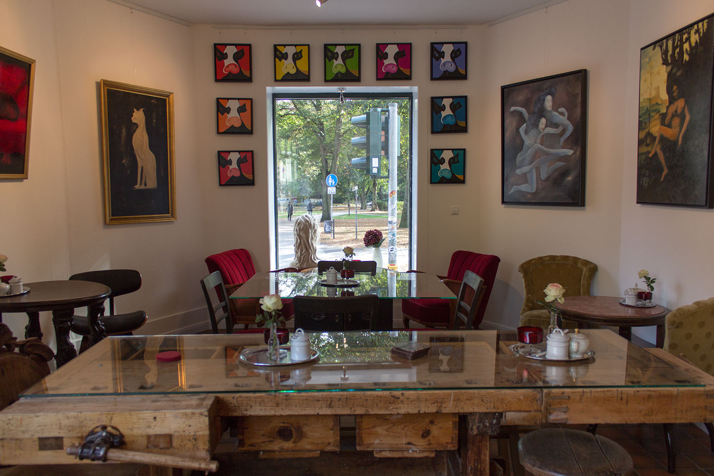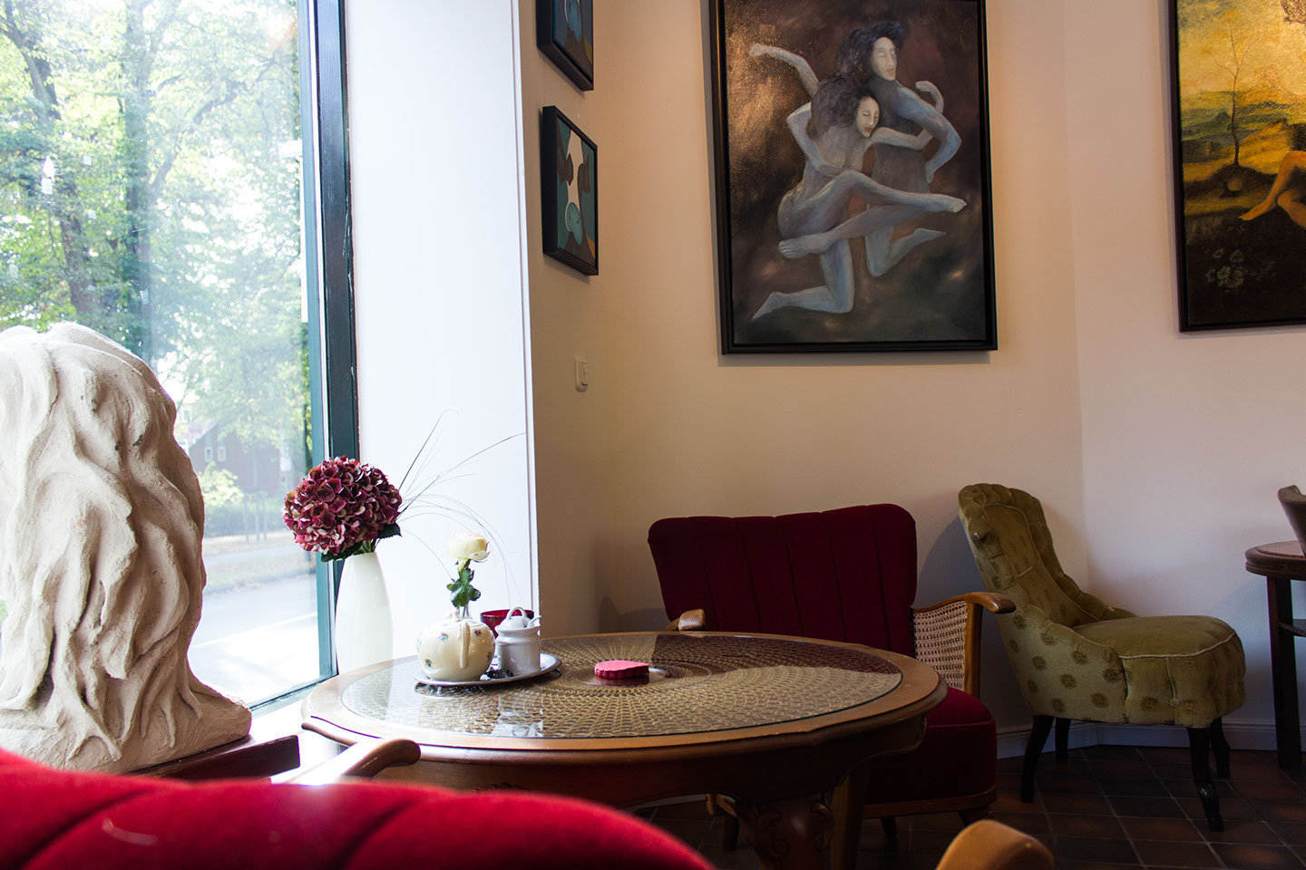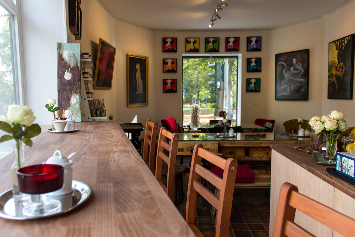 Besuchen Sie die integrierte Galerie im Café mit monatlich wechselnden Ausstellungen.